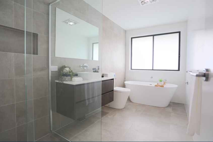 Bathrooms: Semi-frameless shower screens, wall-hung vanities with 20mm stone benchtops, and freestanding bath